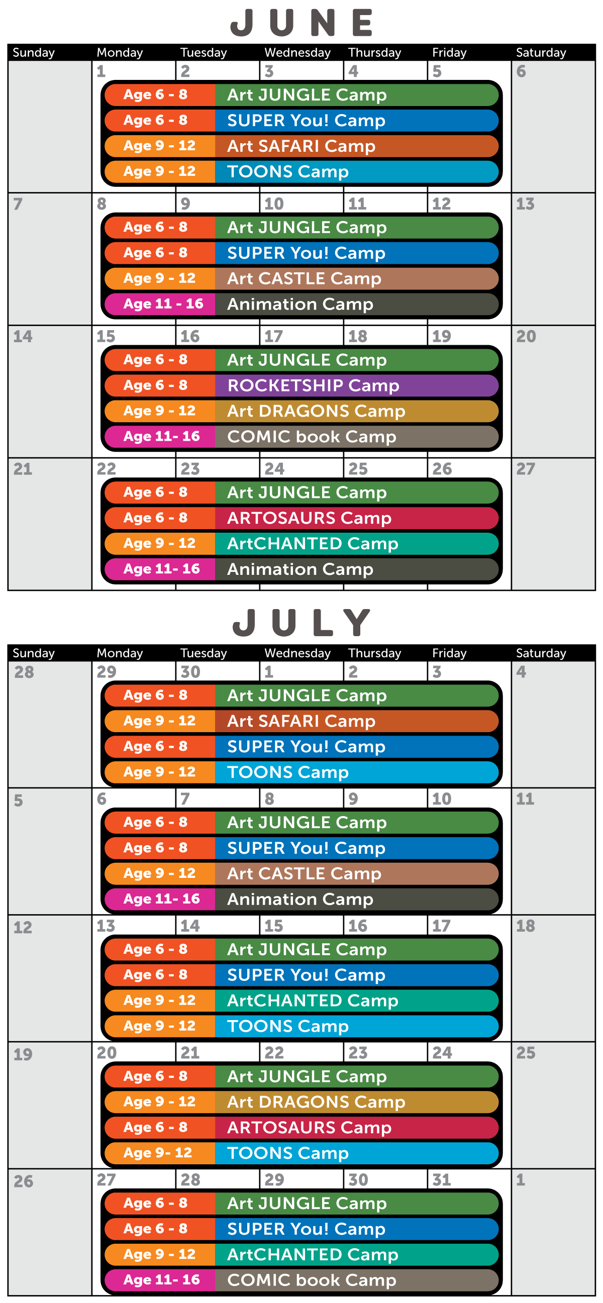 All of our week-long camps are 9:00 AM until Noon, Monday – Friday